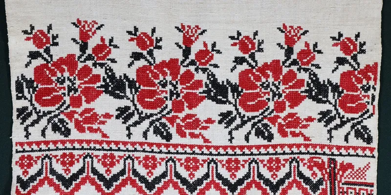 White rushnyk embroidered with white, red, and black threads. Two strips of factory-made lace (geometric ornament) are sewn along the warp to the narrower ends. Patterns are arranged in seven stripes on both ends of the rushnyk, with the center left plain. From the edge to the center, the patterns are as follows: 1) an embroidered garland of tassels; 2) a geometric ornament made with white thread openwork; 3) a wide stripe of embroidered roses (flowers, buds, leaves); 4) a branch of lilies, openworked with white threads; 5) two stripes of geometric ornament (semi-diamonds, with four-petaled rosettes 'inscribed' in the larger semi-diamonds; on one end, the last semi-diamond is replaced by a complex geometric ornament) and a stripe of poppy flowers; 6) three pairs of embroidered birds facing each other; 7) two roosters facing a floral vase, embroidered. The rushnyk is in the so-called 'Brokare' embroidery style. Legend: Used in Kharkiv region, part of the collection of the Sloboda Ukraine Museum named after G.S. Skovoroda (according to the inventory book).