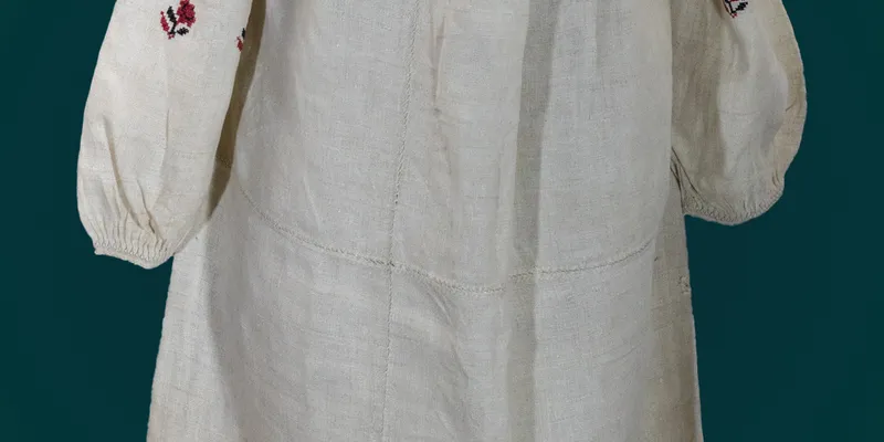 Straight-cut shirt, 'to the hem.' The body of the shirt is sewn from six panels. The sleeve is straight, one-piece, with a gusset, decorated at the bottom with 'pukhlyky' and finished with a narrow binding-cuff. The upper sleeve and body are densely gathered near the neckline using the 'sewing to the collar' technique. The neckline is oval with a 28 cm slit in the center front, finished with a narrow hem with two buttonhole loops at the edges. The shirt is decorated with stylized plant patterns, embroidered with black and red zappolotch (shoulder area, sleeve) and white thread (hem). The sleeve at the shoulder area is embroidered with a horizontal garland of roses with branches and leaves, framed above and below with wavy strips ('cross'). On the sleeve — a scattering of small roses with branches and leaves ('cross'). The hem is folded with a 'single column' and decorated with a wide strip of openwork with an overlay pattern 'kalachyky' — a wavy branch with curled leaves ('openwork'). Legend: Found during an ethnographic expedition in the village of Tsybivka, Krasnokutsky District, Kharkiv Region.