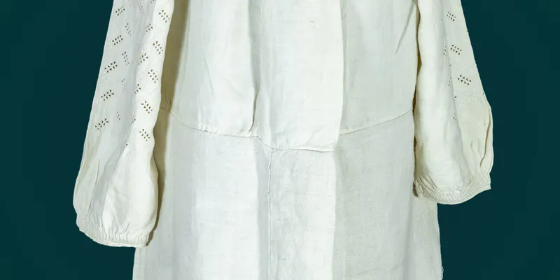 Straight-cut shirt, 'to the hem.' The body of the shirt is sewn from six panels (body from linen canvas, hem from hemp canvas). The sleeve is straight, one-piece, with a gusset, decorated at the bottom with 'pukhlyky' and finished with a hem. The body and upper sleeve are densely pleated near the neckline using the 'sewing to the collar' technique. The neckline is oval, with a 28.5 cm slit in the center front, bound with a narrow binding with two buttonhole loops at the edges for a tie; the tie is crocheted with pink garus yarn. The shirt is decorated with plant-geometric patterns, embroidered in 'white on white' with 'lyshtva,' 'cutting,' and 'vykolyuvannya' techniques (sleeve) and geometric patterns, executed with white thread using 'cutting,' 'verkhoplut,' and 'kuryachiy brid' techniques (shoulder area, hem) and pink, green, and blue 'muline' threads with 'cherv'yachok' (hem). The sleeve at the shoulder area is decorated with a horizontal strip of ornament composed of triangle and 'key' motifs — an S-shaped sign arranged horizontally. The sleeve surface is filled with a vertical ornament on the 'grape branch' motif — a broken line with stylized clusters and leaves. The hem is folded, decorated with a 2.5 cm wide horizontal strip of openwork with a geometric pattern composed of holes. The connecting seams of the panels are decorated at the hem with zigzag lines: two variants in pink and green and one variant in pink and blue. Legend: Woven, sewn, and embroidered by Hanna Ivanivna Rudenko, who lived at the address: Kharkiv Region, Chuhuiv District, village of Bazaliyivka.
