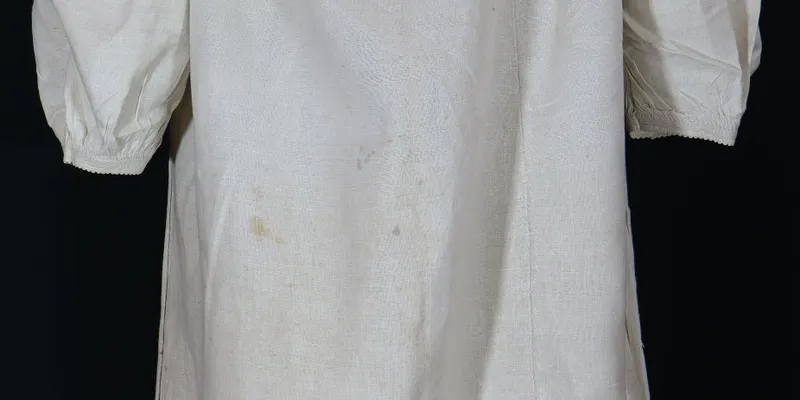 Straight-cut shirt, 'dodilkova.' The body of the shirt is sewn from three panels. The sleeve is straight, one-piece, with a gusset, gathered at the bottom and finished with a hem. The body and upper sleeve are densely pleated near the neckline using the 'sewing to the collar' technique. The neckline is round with a 32 cm slit in the center front, bound with a narrow binding with two buttonhole loops at the edges. The slit is fixed with a fastener. The shirt is decorated with stylized plant (shoulder area, sleeve) and geometric (hem) patterns, embroidered in 'white on white.' The sleeve at the shoulder area is decorated with a horizontal strip of embroidery in the form of a branch, framed above and below with straight lines with attached leaves ('grain stitch,' 'lyshtva'). On the shoulder and sleeve — a scattering of small branches arranged diagonally ('lyshtva,' 'kuryachiy brid'). The sleeve hem is decorated along the edge with stitched buttonholes. The hem is folded with a 'single column' and decorated with a horizontal strip of embroidery, enclosed above and below with zigzag lines, featuring diagonal crosses and S-shaped signs arranged horizontally, so-called 'keys.' Legend: Woven, sewn, and embroidered by Hanna Ivanivna Rudenko, who lived at the address: Kharkiv Region, Chuhuiv District, village of Bazaliyivka.