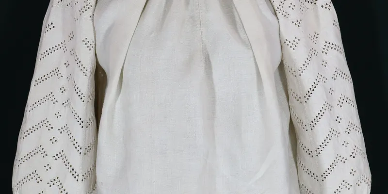 Straight-cut shirt, 'stanok.' The body of the shirt is sewn from one panel, cut crosswise. The sleeve is straight, one-piece, with a gusset, gathered at the bottom into fine folds using the 'sewing to the collar' technique, finished with a 3.5 cm wide cuff with two buttons, overcast with white threads. The body and upper sleeve are densely gathered near the neckline using the 'sewing to the collar' technique. The neckline is round, with a 23 cm slit in the center front, bound with a narrow binding with two buttonhole loops at the edges for a tie. The slit is fixed at the bottom with a fastener. The shirt is decorated with geometric and plant-geometric patterns, embroidered in 'white on white.' The shoulder area of the sleeve is decorated with a horizontal strip of diamond ornament, featuring a diamond with an inscribed four-petal flower and a half-diamond. The ornament is framed on all four sides with narrow straight strips with attached four-petal half-flowers and half-diamonds ('cutting,' 'lyshtva,' 'backstitch'). On the shoulder — four stylized flowers arranged horizontally ('cutting,' 'lyshtva'). The sleeve surface is filled with a vertical embroidery on the 'branch' motif — three stems with 'broken' branches ('cutting,' 'lyshtva,' 'kuryachiy brid'). The cuff is embroidered with a geometric ornament: diamonds with sprouts and 'ram's horns' ('lyshtva'), the cuff edge is decorated with stitched buttonholes ('buttonhole stitch'). Legend: Woven, sewn, and embroidered by Hanna Ivanivna Rudenko, who lived at the address: Kharkiv Region, Chuhuiv District, village of Bazaliyivka.