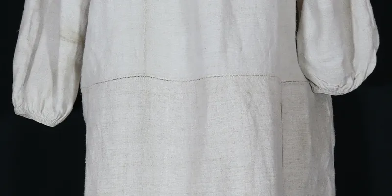 Shirt of straight silhouette, "to the hem" (the body is sewn from thinner canvas, the hem—from coarser). The body of the shirt is sewn from six panels. The sleeve is straight, with a gusset and cuff, sewn along the weft, gathered at the bottom into fine pleats and finished with a narrow hem. The body and cuff are densely gathered near the neckline using the "sewing to the collar" technique. The neckline is "square" with a slit in the center front 27 cm long, finished with a narrow piping with two loop fasteners at the edges. The shirt is decorated with stylized plant-geometric ornament, embroidered "white on white" using "chicken scratch", "stem stitch", "cutwork" techniques (cuff, sleeve) and hemstitch technique (hem). The cuff and sleeve are decorated with horizontal stripes of ornament. The cuff ornament consists of a broken line with four-petaled half-flowers in the indentations, bordered above and below by straight lines with pyramids of three "windows". The embroidery ornament on the sleeve is composed of rhombus motifs, outlined above and below by even lines with pyramids of three "windows" and double leaves placed at certain intervals. The placket and hem are hemmed with a "single column". The hem is decorated with two horizontal stripes of hemstitch with geometric ornament (crosses, rhombuses), formed by small holes.