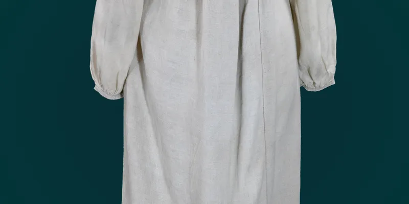 Shirt of straight silhouette, "long". The body of the shirt is sewn from three panels of coarser canvas, and the sleeves—from thinner canvas. The sleeve is straight, one-piece, with a gusset, gathered at the bottom into fine pleats and finished with a hem. The upper edge of the sleeve and the body are densely ruffled near the neckline using the "sewing to the collar" technique. The neckline is round with a slit in the center front 27 cm long. The shirt is decorated with geometric ornament, embroidered "white on white" (shoulder, sleeve, hem). The shoulder is decorated with a horizontal stripe of embroidery with rhombic ornament "wrapped wedges" ("stem stitch"). The sleeve is decorated with small geometric bouquets, arranged horizontally in two rows ("stem stitch"). The hem is sewn to the front side with "backstitch" ("back needle") and decorated with a horizontal stripe of embroidery with oblique geometric oak leaves, outlined above and below with a zigzag line with extensions.