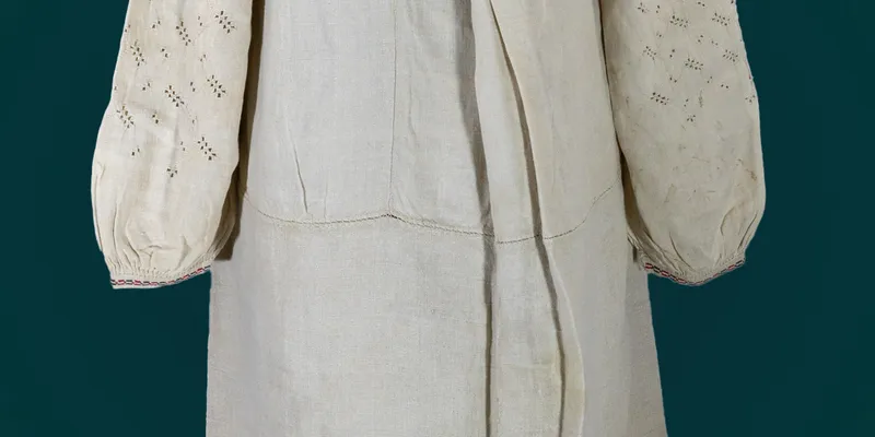 Shirt of straight silhouette, "to the hem", sewn from six panels, body sewn from thin canvas, hem—from coarser. The sleeve is straight, one-piece, with a gusset, gathered at the bottom on a hem. The top of the sleeve and the body are finely ruffled near the neckline using the "sewing to the collar" technique. The neckline is round with a slit in the center front 37 cm long, finished with a narrow hem. The slit at the bottom is fixed with a fastener. The shirt is decorated with stylized plant, plant-geometric and geometric ornaments, executed "white on white" (sleeve, hem) using "cutwork", "stem stitch", "chicken scratch", hemstitch techniques and black and red wool (sleeve hem and hem) using "cross-stitch" and "worm" techniques. The sleeve on the shoulder is decorated with a horizontal stripe of embroidery, composed of slanted leaves, outlined above and below by straight lines with attached double leaves and "pyramids" of three "windows". The sleeve field is filled with three vertical zigzag lines with leaves (variant of "branches"). On the sleeve hem, a "chain" in black-red color is laid, embroidered with "cross-stitch". The hem is hemmed with a "single column" and decorated with a hemstitch stripe 6 cm wide, the elements of which are a flower and a sign similar to a "swastika" or Byzantine meander. Two joining seams of the hem are decorated with a garland of roses and leaves, embroidered in black and red wool with "cross-stitch", one seam decorated with black-red "worm".