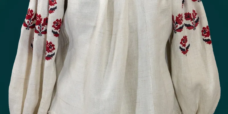 Women's shirt "body" (to the waist). Straight silhouette, from two panels, which at the bottom are extended 15 cm with coarser fabric. Long sleeve, wide, with cuff, sewn along the weft, with gusset, gathered at the bottom into fine pleats, on a hem 0.5 cm wide. The body and cuffs near the neckline are gathered using the "sewing to the collar" technique. The neckline is round, with a slit in the center front 28.5 cm long, with a button. The cuffs, sleeves, and neckline hem are decorated with embroidery in red and black floss threads, executed using "rolled stem stitch", "staple stitch", "stem stitch", "cross-stitch", "double cross-stitch", "stem seam" techniques. On the sleeves and cuffs, two wide horizontal stripes of pattern, consisting of rhombuses and half-rhombuses. In the center of the rhombuses and half-rhombuses, stylized geometric four-petaled flowers are inscribed. The outline of this pattern is composed of the same flowers.