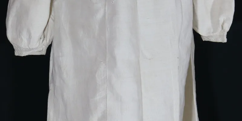 Women's shirt "long". Straight silhouette, body sewn from three panels. Long sleeve, continuous, with gusset, gathered at the bottom into fine pleats, on a cuff 2 cm wide. The body and sleeves are gathered near the neckline and shaped using the "sewing to the collar" technique. The neckline is oval, with a slit 34 cm long in the center front, with a narrow hem, which, like the front slit, is decorated with "backstitch". At the ends of the hem, two loop fasteners for a ribbon. The sleeve and hem of the shirt are embroidered "white on white" with bleached linen threads, the joining seams of the hem—with red and black wool using "satin", "gathering", "backstitch", "stick", "cross-stitch" techniques. On the shoulder, a horizontal stripe of pattern 3 cm wide, consisting of incomplete rhombuses, in the indentations and middle of which smaller rhombuses with four-petaled half-flowers at the top are inscribed. The pattern on two sides is outlined with a backstitch stripe, to which half-flowers are attached rhythmically repeating. On the sleeve in a checkerboard pattern, scattered "berehynias". The cuffs are outlined with buttonhole seam, and their middle is decorated with a pattern of "keys" and oblique crosses. On the hem, a horizontal stripe 1.7 cm wide is embroidered, consisting of a zigzag line with extensions, closed on two sides with "separating stick". The joining seams of the body at the hem at a height of 6 cm are decorated with two vertical rows of crosses.