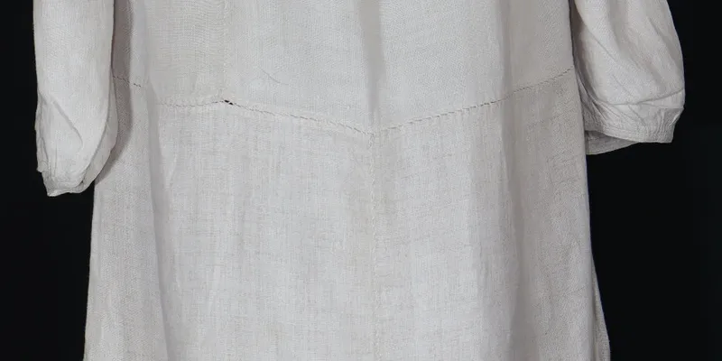 Women's shirt "to the hem", sewn from six panels; body and sleeves from thin, and hem—from coarse canvas. Straight silhouette, long sleeve, continuous, with gusset, gathered at the bottom into fine pleats, on a narrow hem. The sleeves and body are gathered near the neckline and shaped using the "sewing to the collar" technique. The neckline is round, with a slit in the center front. The neckline hem is decorated with "backstitch". At the ends of the hem, two slit loops for a ribbon. The sleeve and hem are decorated with embroidery with bleached linen threads and floss. The embroidery is executed using "cutwork", "stem stitch", "cross-stitch" techniques. In the upper part of the sleeve, on the shoulder, a narrow horizontal stripe with incomplete rhombuses with extensions, along the sleeve field—scattered rhombuses, the outer sides of which are supplemented with eight extensions. The hem is hemmed with hemstitch and decorated with a wide horizontal stripe of zigzag pattern, outlined on two sides with hemstitch. The joining seams at the hem to a height of 9 cm are decorated with a thin stripe of plant ornament.