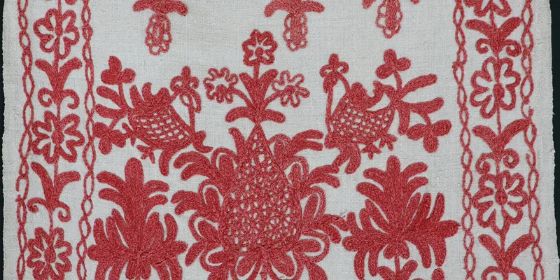 Gray rushnyk embroidered with red threads. The floral ornament is mirror-repeated at both ends. The embroidery composition consists of the main part: a tree of life with a trunk growing from a vase, with stylized flowers on branches, and two stylized birds near the top flowers; above the tree, a scattering of flowers; the base: a wide horizontal floral branch; the border: a floral ornament strip running along the rushnyk. The main part is separated from the border by a chain-like strip, and the entire composition is outlined by a similar strip. The base is separated from the central part by a strip of stylized flowers.