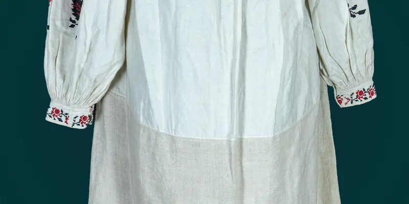 Women's shirt 'to the hem.' Straight silhouette, body and hem sewn from five parts. The body is made from two panels of white factory canvas, the hem from three panels of coarse hemp canvas. The sleeve is long, straight, wide, with an insert sewn along the base, with a gusset, gathered at the bottom into a cuff (3.8 cm wide). The cuffs have buttonholes for buttons and are stitched with two rows of 'stem stitch' at the top and bottom. The body and inserts are gathered at the neckline into small pleats using the 'sewing to the collar' technique. The neckline is round with a thin band stitched with two rows of 'stem stitch.' At the end of the band is a buttonhole for a button. A 29 cm slit in the center front of the neckline has a placket attached. The sleeves, inserts, cuffs, and placket are embroidered with red and black cotton thread in a floral ornament. The insert and upper part of the sleeve have a horizontal pattern stripe of stylized tulips connected by stems and elongated leaves (6 cm wide). The sleeve has a scattered pattern of roses (Rosa centifolia). The cuffs and placket feature a wavy branch with roses and leaves (2 cm wide). The hem is decorated with teeth, hemmed with openwork. At the bottom of the hem is a horizontal stripe (2.5 cm wide) of geometric ornament (zigzag line with geometric figures in the recesses), framed on both sides by openwork borders. The embroidery is done with bleached hemp threads using 'cutting' and 'smooth' techniques. Legend: Used in Kharkiv region, part of the collection of the Sloboda Ukraine Museum named after G.S. Skovoroda (according to the inventory book).