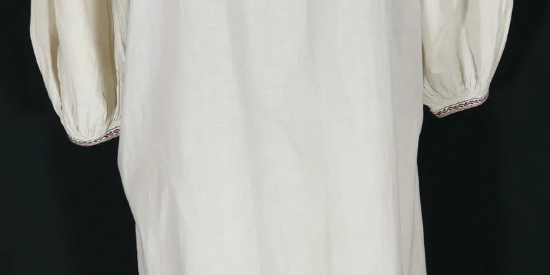 Straight-silhouette 'dodillna' shirt. The bodice is sewn from two panels. The sleeve has a gusset and shoulder inset sewn along the weft, gathered at the bottom into small pleats and finished with a narrow binding with a loop and button fastening; decorated at the top with 4 cm 'puffy' gathers. The bodice and shoulder inset are gathered near the neckline using the 'sewing to collar' technique. The round neckline has a 20 cm slit at the center front, finished with a narrow edge. The shirt is decorated with stylized floral ornaments embroidered with black and red zari thread (shoulder inset, sleeve, sleeve binding), light lilac zari thread, and white threads (hem), and geometric black-and-red ornaments (neckline binding). The shoulder inset and sleeve are decorated with oak branches with acorns and leaves ('tambour'). The sleeve binding has a wavy branch with leaflets, framed above and below by straight strips ('cross-stitch,' 'backstitch'). The neckline binding is decorated with small serrations along the upper edge and stitched with a red straight strip, below which is a zigzag line ('serration,' 'backstitch,' 'verkhoplut'). The hem is finished with a 'single prutik' and adorned with two openwork bands: a narrow and a wide one, with six-petal flowers and curled leaflets.