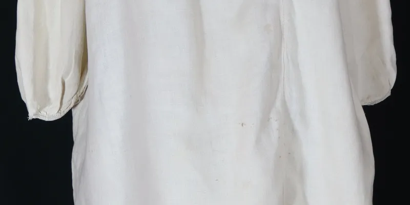 Women's 'dodillna' shirt. Straight silhouette, bodice sewn from three panels, long sleeve with shoulder insets sewn along the weft, with a gusset, gathered at the bottom into small pleats on a narrow binding stitched with 'backstitch.' The bodice and shoulder insets are gathered near the neckline and finished with the 'sewing to collar' technique. The neckline is rectangular with a slit at the center front, with a 0.5 cm wide binding. At the ends of the binding are two slit loops for a ribbon. The shoulder insets are joined to the bodice on the back with 'double backstitch,' to the sleeves with 'backstitch' and 'puffy' gathers. The underarm is finished with a 'prutik.' The sleeves and shoulder insets are decorated with embroidery consisting of two horizontal bands. The floral ornament—flowers and leaves connected to each other—is done in 'cross-stitch' with dark gray cotton threads. The sleeve band is incomplete, with a 4 cm gap in the middle.