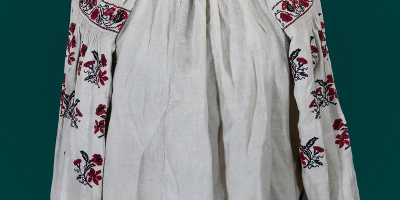Shirt with a straight silhouette, 'body' (to the waist). Sewn from three panels. The sleeve is straight with an insert sewn along the warp, gathered at the bottom into small pleats using the 'sewing to the collar' technique and finished with a wide band with double 'stem stitch,' decorated at the top with 'puff stitches' (11 cm long). The sleeve and insert on the back side are sewn with a double 'stem stitch.' The body and inserts are gathered at the neckline into small pleats using the 'sewing to the collar' technique. The neckline is square with a 25 cm slit in the center front, finished with a narrow band with triple 'stem stitch,' fastened with a loop buttonhole (right) and a white plastic button (left) at the edges of the band. The shirt is decorated with a black and red floral ornament. At the edge of the insert is a wavy line formed by periwinkle stems with flowers, leaves, and tendrils, framed on both sides by stripes of stylized leaves. The sleeve features a scattered pattern of ornamental motifs of the same character: periwinkle branches with leaves and tendrils. Legend: The shirt was made for a bride's dowry.