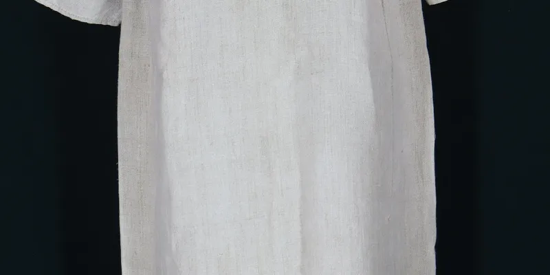 Tunic-style shirt made of unbleached hemp canvas. The bodice is sewn from three pieces of canvas. The central panel (50 cm wide) is folded in half, with side panels (21 cm wide) slightly angled on the inner side. The sleeve is fully cut, three-quarter length, sewn along the grain with 'backstitch,' angled, and finished at the bottom with a thin 0.5 cm edge. The round neckline has a 25 cm slit at the center, finished with 'backstitch.' At the ends of the binding, there is a loop on the left and a brown button on the right. The joining seams of the bodice at the bottom are decorated with a 'worm' stitch in blue, green, and black 'mouline' threads. The hem is finished with a 'prutik' openwork and decorated with another parallel 1.5 cm wide openwork row. The openwork ornament is geometric (zigzag 'angles') made with bleached hemp threads.