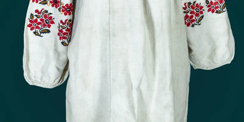 Shirt made of white hemp canvas (body from fine canvas, hem from coarse canvas). 'To the hem' style with a straight silhouette. The body and hem are made from six parts. The sleeve has an insert sewn along the warp, straight, with a gusset, gathered with 'puff stitches,' and gathered at the bottom into a band. The body and inserts are gathered at the neckline. The neckline is square ('kare') with a slit in the center, finished with a narrow band. On the left side of the band is a loop buttonhole, and on the right is a light brown button. The inserts and sleeves are embroidered with black, red, and yellow threads in a floral ornament using the cross-stitch technique. The insert has a wide horizontal pattern stripe of roses (Rosa centifolia) connected by branches and leaves. The rose stripe is framed by borders of small stylized flowers. The sleeve has a narrower horizontal pattern stripe of round flowers in the center. The upper and lower parts of the sleeve feature scattered bouquets of stylized flowers. Legend: The shirt was made by Sheikina Ulyana Fedorivna.