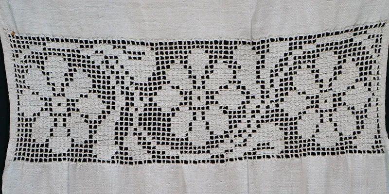 Blue rushnyk decorated at the ends with openwork and lace. The openwork consists of four rows in the following order: an edge with openwork through a needle and columns; a strip of flat flowers; and two mirror-repeated strips of branches with flowers, made with columns and inlay. The lace consists of a net woven with chains and columns, with conditional fillings ('keys,' 'spiders').