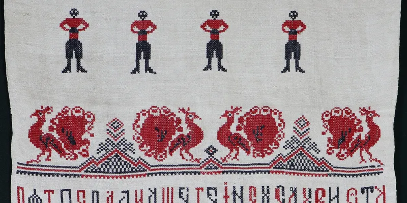 White rushnyk embroidered with red and black threads. The ornaments are floral, zoomorphic, geometric, anthropomorphic, and textual, arranged at the ends in the following order (from ends to center): 1. garland of tassels; 2. rose branch; 3. textual band (one end reads 'OUR LORD JESUS CHRIST,' though the text is generally difficult to decipher); 4. two pairs of peacocks between geometric patterns; 5. four male figures with hands folded in prayer; 6. diamonds; 7. five squares embroidered with red thread in 'satin stitch'; 8. four similar squares (each composed of five smaller squares) embroidered with black thread in 'satin stitch.' The ends are hemmed with openwork, with homespun lace featuring white and red tassels, woven in chain and column techniques.