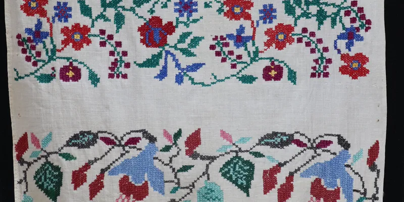 White rushnyk embroidered with white, yellow, red, raspberry, pink, terracotta, blue, dark blue, green, emerald, dark green, and black threads. The floral ornament is located at the ends in two bands of floral garlands and three vignettes with wreaths arranged in a triangle. The narrower edges, hemmed with openwork, have lace with a serrated edge, featuring a net and diamond-shaped motifs. One side of the rushnyk is machine-hemmed, the other is the fabric selvedge.