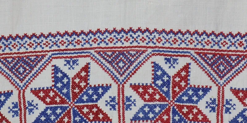 Rushnyk made of white cotton fabric, decorated along the edges with stylized floral-geometric ornament embroidered with red and blue threads: a wide band of large octagons, each containing eight-pointed 'stars,' with small triangles in the recesses; above the band, a zigzag line with small diamonds and cross-shaped figures alternating below it; below the band, a zigzag line with eight-pointed 'stars' inside and diamonds with small rectangles and tassels outside. At one end, above the ornament, an illegible monogram is embroidered. The edges are hemmed with 'single prutik' openwork and decorated with serrated lace with a diamond-shaped ornament.