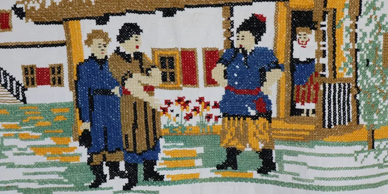 Rushnyk made of white factory-produced cotton canvas, decorated with narrative embroidery 'Taras Bulba' executed in the 'cross-stitch' technique with multicolored threads. The embroidery, located at the ends, depicts Taras Bulba meeting his sons in the courtyard, with their mother at the doorstep. The rushnyk is hemmed with 'single prutik' and decorated with woven lace with serrated edges.