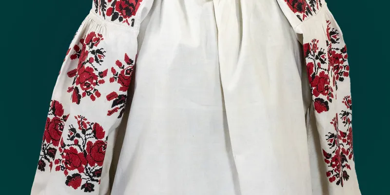 Shirt with a straight silhouette, 'body' (to the waist). Sewn from two panels. The sleeve is straight with a gusset and an insert, sewn along the warp, gathered at the bottom into small pleats using the 'sewing to the collar' technique, on a narrow band with a single 'stem stitch,' decorated at the top with four rows of 'puff stitches' (10 cm long). The sleeve and insert on the back side are sewn with a double 'stem stitch.' The body and inserts are gathered at the neckline into small pleats using the 'sewing to the collar' technique. The neckline is square with a 26 cm slit in the center front, finished with a narrow band with double 'stem stitch' and a loop buttonhole on the right side. The shirt is embroidered with black and red floral and geometric ornaments. The neckline band has a red thread broken line. The insert has a horizontal stripe of roses (Rosa centifolia) at the edges and carnations in the center with leaves and branches (10.5 cm wide). The sleeve features a scattered pattern of ornamental motifs: bouquets of roses (Rosa centifolia) with leaves and branches. Legend: The shirt was purchased during an ethnographic expedition by the Kharkiv Historical Museum in 1959.