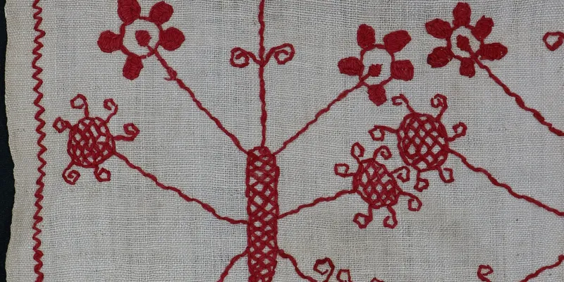 Rushnyk made of gray homespun hemp canvas. The edges feature stylized floral ('tree of life,' small flowers) and geometric ornaments embroidered with red threads.