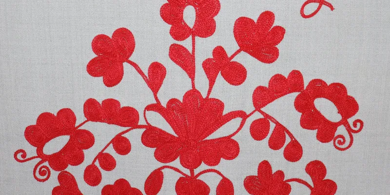 Rushnyk made of gray polyester fabric, embroidered with red threads. The ornament is floral, featuring vases with flowers, and a wavy branch border at the edges.