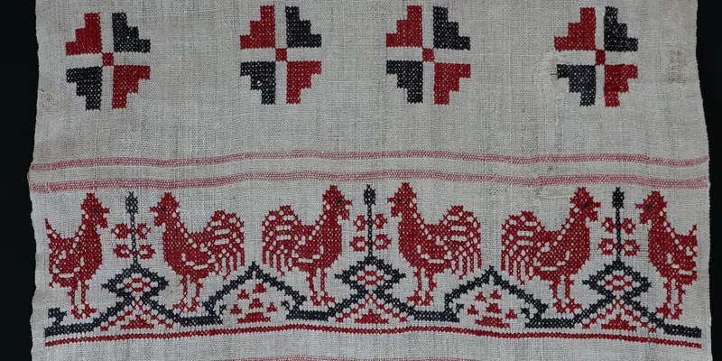 Rushnyk made of homespun bleached hemp canvas, sewn from two parts. Decorated with red horizontal woven stripes, between which are stylized floral and floral-geometric ornaments embroidered with black and red threads: large four-petal flowers, irises, grapevines with leaves, garlands of flowers with leaves, a wide band of openwork with inlaid squares, and a garland of large roses with leaves. The ends are decorated with woven fringe with tassels.