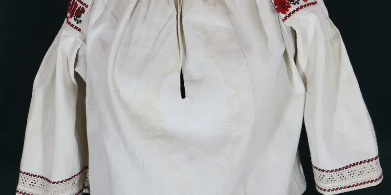 Shirt with a straight silhouette, 'body' (to the waist). Sewn from three panels. The sleeve is straight with a gusset and an insert, sewn along the base, straight at the bottom, hemmed with a double 'stem stitch,' decorated at the top with 'puff stitches' (11 cm long). The sleeve and insert on the back side are sewn with a double 'stem stitch.' The body and inserts are gathered at the neckline into small pleats using the 'sewing to the collar' technique. The neckline is oval with a 23 cm slit in the center front, finished with a narrow band stitched with triple 'stem stitch' and two buttonholes at the edges. The shirt is decorated with floral and geometrized floral ornaments in black and red threads. The insert has roses with branches and leaves (3.2 cm wide stripe). This embroidery is framed on both sides by an ornament of connected diamonds. The bottom of the sleeve is decorated with a 2 cm wide openwork stripe through the grid without a bar, followed by a single bar stripe 0.7 cm below. The openwork is framed on both sides by parallel stripes of a broken line ornament. Legend: The shirt was embroidered and used in the family of a participant in the 1905 peasant uprisings in the village of Staryi Saltiv (Kharkiv Governorate, Vovchansk County, later Kharkiv Oblast, Vovchansk District). Embroidered by Sytnyk Yukhymiya Pavlivna, wife of Sytnyk Saveliy Andriyanovych. Purchased by the Kharkiv Historical Museum's ethnographic expedition in 1959.