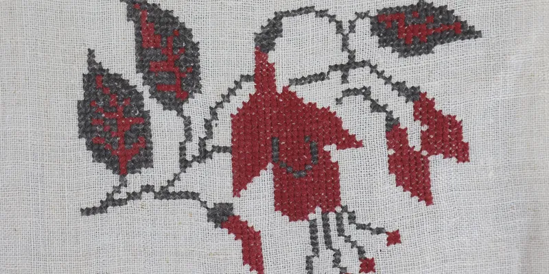 Rushnyk made of bleached homespun canvas, embroidered with red and black threads. The ornament is floral. The composition is tiered, with the upper row consisting of two flowers, below them a vase with a bouquet, and further below a stripe of floral ornament.