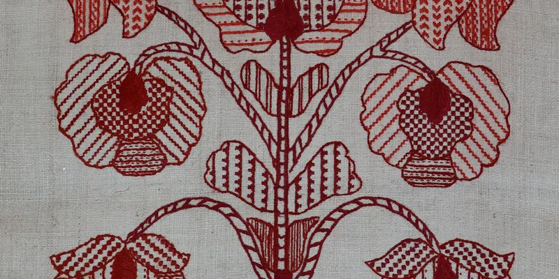 Rushnyk made of homespun fabric, embroidered with red threads. The ornament is floral, in the form of a 'tree of life.' The edges are decorated with a wide wavy floral branch. Along the sides, there is a wavy branch with leaves. The edges are finished with 'obmetytsia'.