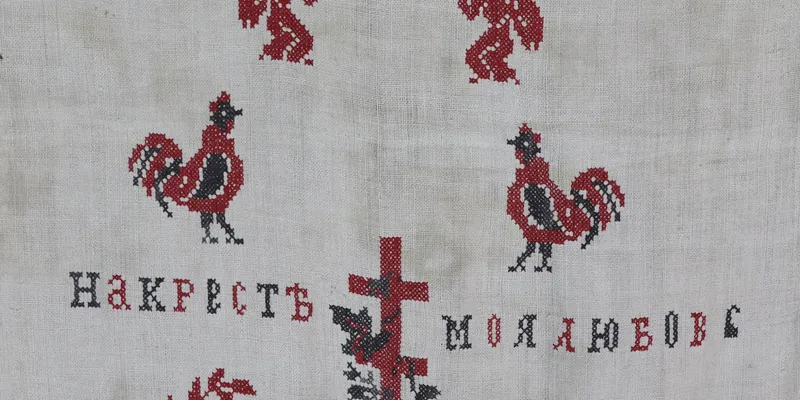 Rushnyk made of bleached homespun canvas, embroidered with red and black threads. The ornament is floral and ornithomorphic. The composition is tiered. The upper part features roosters and floral branches. The central composition is a cross surrounded by flowers and birds. Above and below, the inscription reads: «On the cross is my love, under the cross is my grave.» Below are floral garlands.