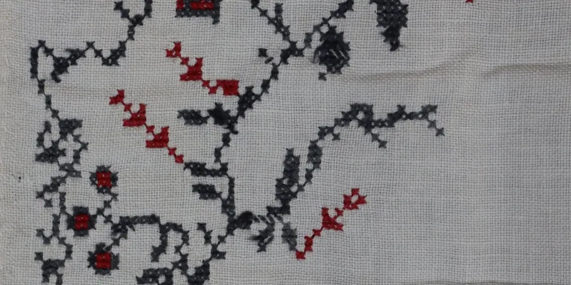 Rectangular white rushnyk made of homespun bleached hemp canvas, decorated with floral, zoomorphic, anthropomorphic, and narrative ornaments (birds, floral vases, wreaths, branches, churches, crosses) in red and black threads. The ends are finished with homespun white lace. The ornament is arranged in tiers at the ends of the rushnyk.
