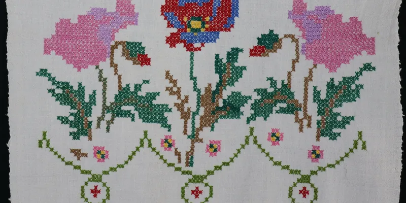 Rushnyk made of bleached canvas, embroidered with green, pink, blue, yellow, red, and gray threads. The ornament is floral. The composition is tiered, with the upper tier consisting of individual poppy flowers and the lower tier featuring a broken branch with large flowers. Between them is a strip of lace with a geometric ornament (rhombus motif). The edge is finished with scalloped lace.