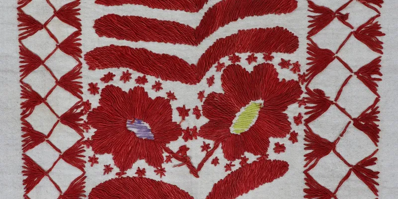 - Factory weaving, hand embroidery, double 'cross-stitch' ('Bulgarian'), diagonal 'satin stitch' ('lyshtva')