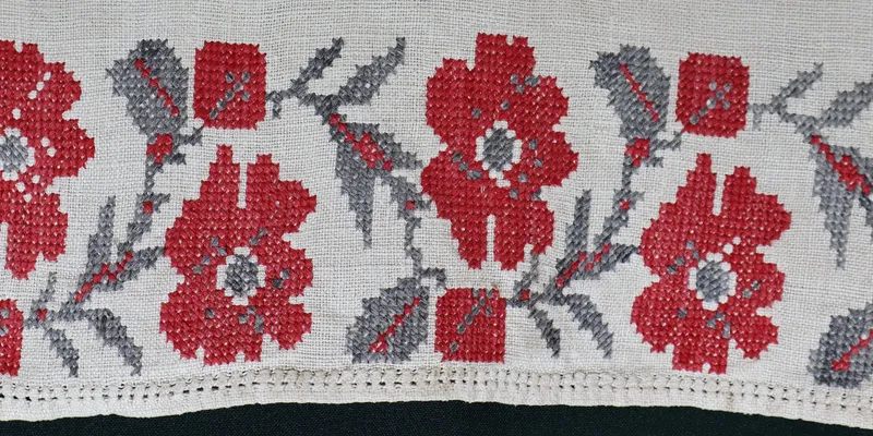 Rushnyk made of bleached canvas, embroidered with red and black threads. The ornament is stylized floral. The ends are decorated with a band of floral ornament in the form of a wavy rose branch with buds and leaves. The rushnyk is finished with 'double prutik' openwork.
