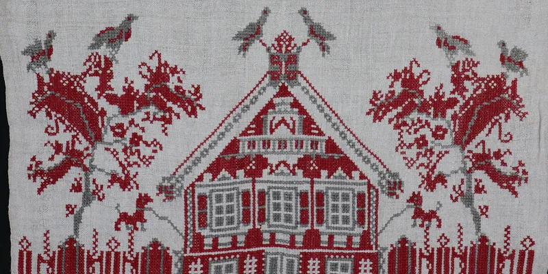 Rushnyk made of homespun bleached canvas, embroidered with red and black threads. The embroidery is narrative with floral, ornithomorphic, and zoomorphic ornaments. At the edges, there is an image of a two-story building with a triangular roof, five windows, and a balcony. A fence is near the building. Behind the fence, on both sides of the building, are trees with two birds in their crowns. Birds are also on the roof around the chimney. To the left and right of the building are images of dogs. Below the narrative composition is a wide band of floral ornament, consisting of two narrow lines with buds extending downward and large flowers (poppies) and leaves upward, connected by a stylized flexible branch. Above the composition are two roosters facing each other, with a separate grapevine branch between them. Higher up are two separate branches with butterflies. The rushnyk is finished with 'single prutik' openwork. The ends are hand-sewn with lace featuring a stylized floral ornament of openwork leaves.