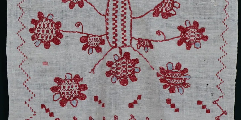 Rushnyk made of bleached linen canvas, embroidered with 'rushnyk stitch' using red threads, with blue and white thread accents. The ends are decorated with stylized floral and floral-geometric ornaments arranged vertically: a 'tree of life.' From an oval-shaped stem, ten thin stalks extend in all directions with large multi-petal flowers at the ends, with scattered groups of three small rectangles with leaves and curled tendrils above and below, as well as branches with leaves of various shapes and sizes. The composition is framed on three sides by a serrated band, with larger teeth at the bottom. The edges are hand-hemmed with a hem stitch.