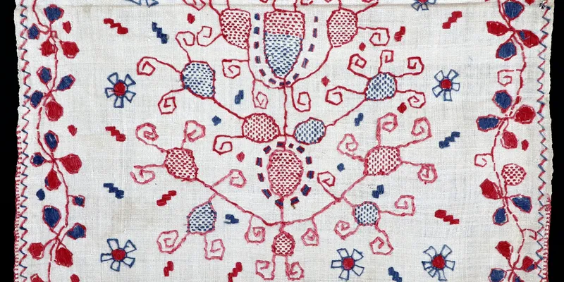 Rushnyk sewn from two parts of homespun bleached linen canvas, embroidered with red and blue threads. The ornament is stylized floral-geometric and geometric. The ends are decorated with a large branch ('tree' motif) with a thin stem and curls. Above the tree is a horizontal zigzag band. Around the perimeter is a wavy branch with leaves and, in places, berries and a zigzag line. Scattered across the field are five-petal flowers and figures composed of diamonds and rectangles. The edges are hemmed with 'obmetytsia' and were decorated with a calico frill.