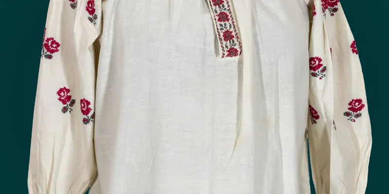 Shirt made of factory fabric, with a straight silhouette. The sleeve has inserts. The insert and body are gathered near the collar. The sleeve is finished with a cuff at the bottom. The insert, sleeve, cuff, and chest area are embroidered with red and black threads. The ornament is floral, in the form of roses.