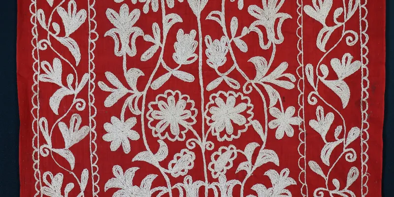 Rushnyk made of factory-produced calico fabric, embroidered with white threads. The ornament is stylized floral. The ends are decorated with three floral branches ('tree' motif): the central branch with roots, a straight stem, topped with a large eight-petal flower. On both sides are wavy branches with large and small flowers and leaves. Above the composition are scattered individual three-petal flowers. The rushnyk is framed by a double chain frame, with a wavy floral branch at the bottom and a wavy branch with leaves on the sides.