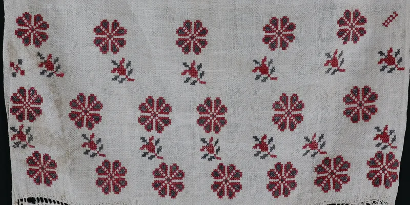 Rushnyk made of homespun bleached hemp canvas, embroidered with red and black threads. The ornament is stylized floral and floral-geometric, alternating with openwork. The ornament consists of three tiers.