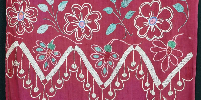 Rushnyk made of factory-produced burgundy fabric, embroidered with white, blue, green, yellow, and orange threads. The ornament is stylized floral, floral-geometric, and geometric. The ends of the rushnyk feature a three-tiered ornament: 1) a wide band imitating lace with a zigzag edge and branches with four- and six-petal flowers, buds, and leaves; 2) three multi-petal flowers, framed on one side with leaves and on the other with small flowers; 3) a wide band imitating lace with a scalloped edge and branched floral motifs with leaves. One longitudinal edge is machine-hemmed. The narrower edges are hand-hemmed. Handwoven lace with a geometric 'diamond' pattern is attached to the ends, with serrated edges.