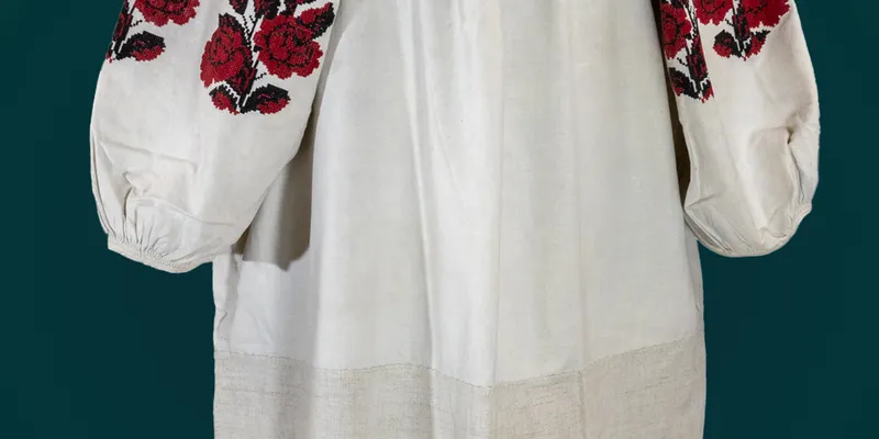 Shirt with a straight silhouette, 'to the hem.' The body and hem are sewn from five panels (body from two, hem from three). The sleeve is straight with a gusset and an insert, sewn along the warp, gathered at the bottom into small pleats using the 'sewing to the collar' technique, on a narrow band with double 'stem stitch,' decorated at the top with seven rows of 'puff stitches' (21 cm long). The sleeve and insert on the back side are decorated with a double 'stem stitch.' The body and inserts are gathered at the neckline into small pleats using the 'sewing to the collar' technique. The neckline is square ('kare') with a 25 cm slit in the center front, finished with a narrow band with triple 'stem stitch' and a loop buttonhole on the right and a small button on the left. The slit is pleated, with the right side folded to the front and stitched with a single 'stem stitch' as a placket. The bottom of the slit is reinforced with a rectangular piece of fabric (2.7x4.3 cm), decorated around the perimeter and horizontally with a single 'stem stitch.' The shirt is decorated with a large floral ornament in black and red. The insert and upper part of the sleeve have identical 10 cm wide pattern stripes: stylized poppies with leaves and branches. The sleeve features a scattered pattern of roses (Rosa centifolia) with branches and leaves. The hem is hemmed with a 0.7 cm wide openwork stripe of a single column with filling. Legend: Used in Kharkiv region, part of the collection of the Sloboda Ukraine Museum named after G.S. Skovoroda (according to the inventory book).