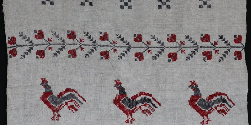 Rushnyk made of homespun bleached hemp canvas, embroidered with red and black threads. The ornament is stylized floral, floral-geometric, geometric, and ornithomorphic. The ends feature a seven-tiered ornament: 1) a thin wavy branch with flowers and leaves; 2) a wavy branch with eight-petal flowers and leaves; 3) a background embroidery of a branch with large roses, berries, and leaves; 4) a wavy 'viburnum' branch; 5) a wide band with five roosters arranged in a checkerboard pattern; 6) a straight horizontal branch with downward and upward floral branches alternating with leaves. Above the tiered ornament are six rows of small rectangles, arranged in groups of five forming diagonal crosses and groups of three forming diagonal lines, alternating between rows of five crosses and six lines. The edges are finished with 'single prutik' openwork.