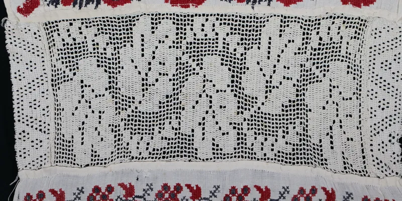 Rushnyk composed of two fragments of white linen canvas, sewn together. Each fragment consists of two parts of different widths, connected by lace inserts. The rushnyk is embroidered with red and black threads. The ornament is stylized floral, floral-geometric, geometric, and ornithomorphic. The ornamental bands are arranged in a tiered composition: 1) a wide embroidered band imitating lace with three teeth, into which three downward floral branches are inscribed; 2) a wavy viburnum branch with clusters and leaves; 3) hand-crocheted lace with a pattern of a wavy branch with oak leaves, supplemented on the sides with lace of a geometric pattern; 4) a wide garland of roses with buds and leaves; 5) a pair of crested birds perched on two floral branches. The rushnyk is finished with 'double prutik' openwork. Handwoven lace with a zigzag edge and an ornament of three large diamonds decorated with 'spiders' is attached to the ends. Cotton factory fabric fragments are sewn to the sides of the lace. All seams are machine-stitched.