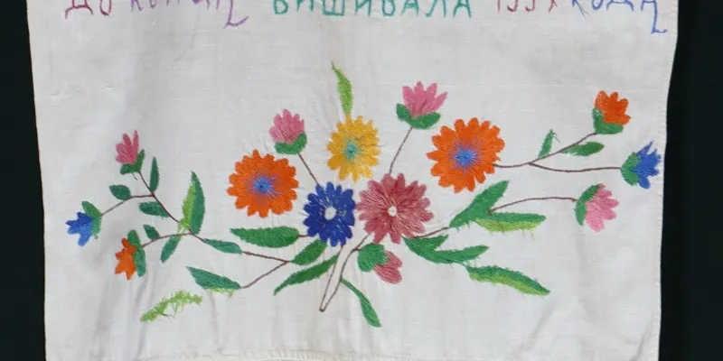 Rushnyk composed of four fragments of white factory-produced fabric of different sizes, sewn together. Lace inserts are sewn between the larger and smaller parts. The rushnyk is embroidered with red, white, pink, lilac, purple, blue, dark blue, green, light green, yellow, and orange threads. The ornament is stylized floral with added textual embroidery. The ends are decorated with a tiered composition: 1) a horizontal 'branch' with many flowers, buds, tendrils, and leaves of various sizes, shapes, and colors, mostly extending upward; 2) lace with a floral-geometric pattern of two grapevine bands; 3) a sprawling bouquet with multi-petal flowers in the center and branches with small flowers and leaves on the sides; 4) textual embroidery on one end: 'Father feeds until the wedding, and husband feeds,' and on the other: 'until the end, embroidered in 1957'; 5) three separate branches with flowers, buds, and leaves. The rushnyk is hemmed with 'single prutik' openwork. One edge is machine-hemmed. Hand-sewn lace with a figured finish, ornamented with a drop pattern, is attached to the narrower ends.