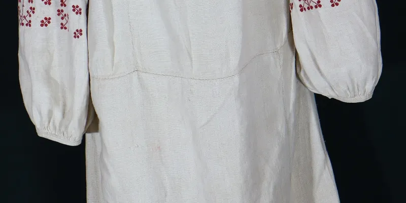 Shirt with a straight silhouette, 'to the hem.' The body and hem are sewn from six panels (body from finer canvas 'odynadtsiatka,' hem from coarser canvas 'deviatka'). The sleeve is straight with a gusset, fully cut, with an inserted part on the inner side, gathered at the bottom into small pleats using the 'sewing to the collar' technique, finished with a narrow band with triple 'stem stitch.' The sleeve is sewn with a double 'stem stitch.' The body and upper part of the sleeve are gathered at the neckline into small pleats using the 'sewing to the collar' technique. The neckline is oval with a 30 cm slit in the center front, finished with a narrow band with triple 'stem stitch' and two buttonholes on both sides. The slit is reinforced at the bottom with a coarse stitch. The shirt is decorated with red thread embroidery of stylized grapes. The shoulder area has a horizontal pattern stripe framed above and below by a thin line with attached berries (5.5 cm wide), followed by a vertically arranged composition: four grape branches with small branches and six berries scattered between them. The neckline band has a red cross-stitch chain. The hem is hemmed with a single column, above which is a 3.5 cm wide white-on-white geometric embroidery stripe of diamond-shaped figures and semi-triangles with small cut-out squares. The connecting seams of the body are decorated at the bottom for 8 cm with a red thread zigzag embroidery. Legend: Canvas woven and sewn by Lozova Kateryna, embroidered by Lozova Domna Hryhorivna.