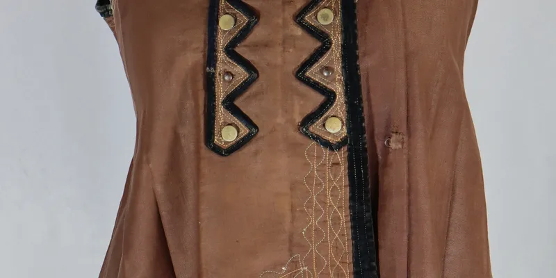 Kersetka of a fitted silhouette, sewn from brown factory-produced fabric. The back is split, with one underarm gusset on each side, widened from the waist downward with five counter-pleats ('mustaches'). The front is widened downward, with the right panel overlapping the left, fastened with three hooks. The right panel is decorated with a serrated appliqué; the waistline on the back is adorned with a figured appliqué decorated with sixteen buttons. The neckline, armholes, right front, and serrated appliqué are edged with a strip of black velvet. The kersetka is decorated at the neckline, armholes, serrated appliqué, right front, hem, and connecting seams with artistic machine stitching. The kersetka is lined with homespun canvas, with some areas retaining embroidery (eight-petal flowers).
