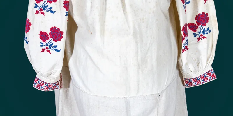 Shirt with a straight silhouette, 'to the hem.' Sewn from five panels (body from two, hem from three). The sleeve is straight with a gusset and an insert, sewn along the base, gathered at the bottom into small pleats using the 'sewing to the collar' technique, on a cuff stitched at the top and bottom with double 'stem stitch,' fastened with a buttonhole and a small plastic button, decorated at the top with 'puff stitches' (6 cm long). The sleeve and insert on the back side are sewn with a double 'stem stitch.' The body and inserts are gathered at the neckline into small pleats using the 'sewing to the collar' technique. The neckline is oval with a 2.5 cm slit in the center front, finished with a narrow band with triple 'stem stitch,' fastened with a loop buttonhole on the right and a small plastic button on the left. The shirt is decorated with a floral ornament embroidered with red and blue threads. The insert has a garland of roses (Rosa centifolia), framed on both sides by stylized flowers (4 cm wide). The sleeves feature a scattered pattern of ornamental motifs of the same character. The cuffs are embroidered with stylized lilies, with the pattern framed on both sides by stylized flowers. The cuff edges are decorated with red threads. The hem is hemmed with a 'single column,' above which is a white thread zigzag line, followed by a 2 cm wide openwork stripe with diamond-shaped figures. The connecting seams of the body are decorated at the bottom with red and blue threads (6 cm long). Legend: The shirt belonged to Mohlot Varvara Mykhailivna, its creator, and her daughter Tymchenko S.V.