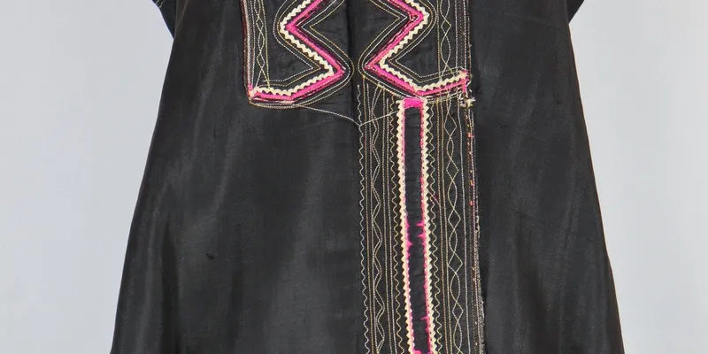Kersetka of a fitted silhouette, sewn from black factory-produced fabric. The back is split, widened from the waist downward with three pleats ('mustaches'). The front is widened downward. The right panel overlaps the left, fastened with two hooks. The kersetka is decorated with multicolored machine stitching. The right panel is adorned with a serrated appliqué. The neckline, right panel, waistline on the back, and hem are decorated with raspberry ribbon and white braid. The kersetka is lined with white factory-produced fabric with blue and red stripes.